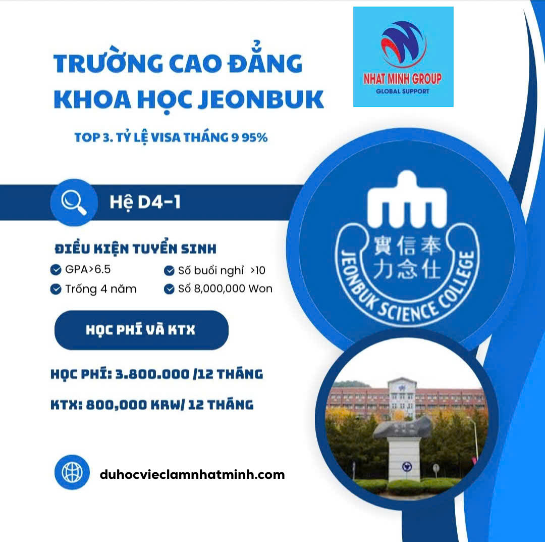 Hàn Quốc, Tuyển sinh du học việc làm Truyển Sinh Trường Cao Đẳng Khoa Học Jeonbuk Top 3, tỷ lệ visa 95% Post Views: 1 admin Cao đẳng Thuế Woongji & Tax Top 3 trường có tỷ lệ đỗ visa cao, 90% bao đỗ trường Tuyển Sinh Đại học Khoa Học Kỹ Thuật Gyeonggy Top 2, tỷ lệ visa 98%, bao đỗ trường – không cần mở sổ