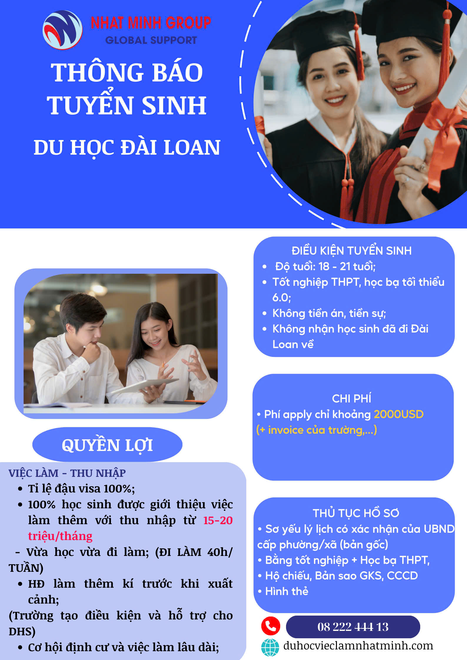 Đài Loan, Tuyển sinh du học việc làm Tuyển Sinh Du Học Đài Loan Post Views: 1 admin Tuyển Sinh Du Học Nhật Bản Cao đẳng Thuế Woongji & Tax Top 3 trường có tỷ lệ đỗ visa cao, 90% bao đỗ trường